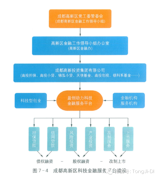 成都高新区专门成立金融工作领导小组,下设金融办公室,建立企业投融资服务例会、企业改制上市协调会等工作协调机制,负责指导高新区投融资服务体系建设工作,归口协调解决企业投融资问题和困难。同时依托成都高新区全资国有公司——成都高新投资集团公司作为投融资服务体系的重要载体,实现了信用担保、股权投资和改制上市服务等多项投融资职能,形成了政府资金引导、民间资金积极参与的投融资服务格局,通过债券融资、股权融资、上市融资等多种创新服务方式,较为有效地破解了科技型中小企业融资难题。见图7-4。